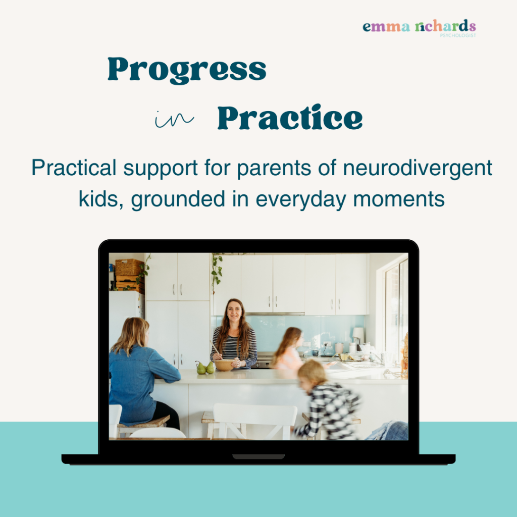 Progress in Practice is a practical, psychologist-designed support package for parents of neurodivergent kids — created to support you in the messy, meaningful moments that shape daily life. It’s built around the real-world challenges families face, helping you navigate routines, regulation, and relationships with tools that are flexible, collaborative, and grounded in everyday experience — not just theory.